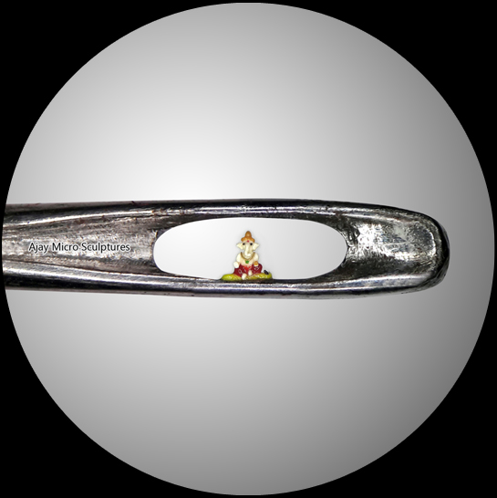 This is my first micro creation and with this I started my work of micro sculptures. It measures Height 0.92mm and width 0.62 mm, Lord Ganesha is adorned with 24 carat gold chain. One can easily make out the tail of the mouse by the side of Ganesha.